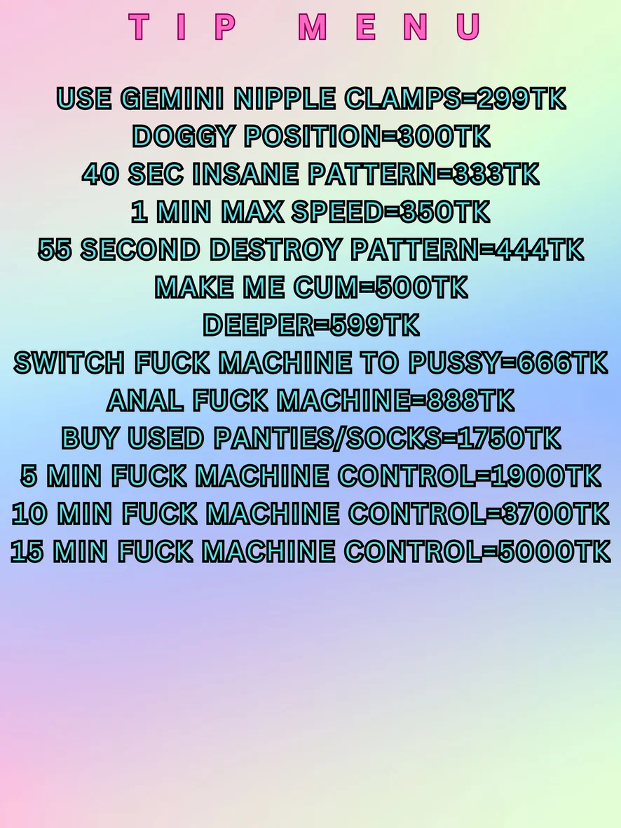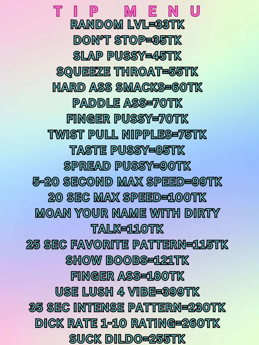 Dildo or Vibrator, Fingering, Flashing, Kissing, Blowjob, Cock Rating, Cock Ring, Deepthroat, Dirty Talk, Facesitting, Facial, Nipple Toys, Sex Toys, Pussy Licking, Anal, Ass to Mouth, Anal Toys, Cosplay, Doggy Style, Gagging, Pump, Topless
